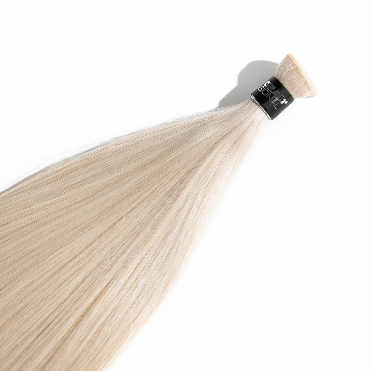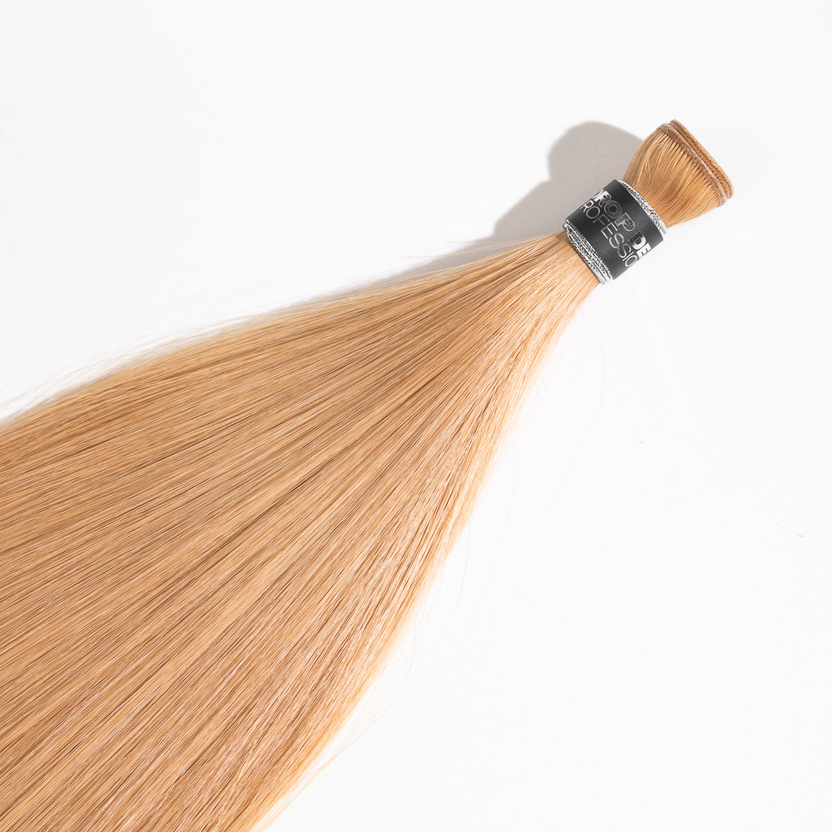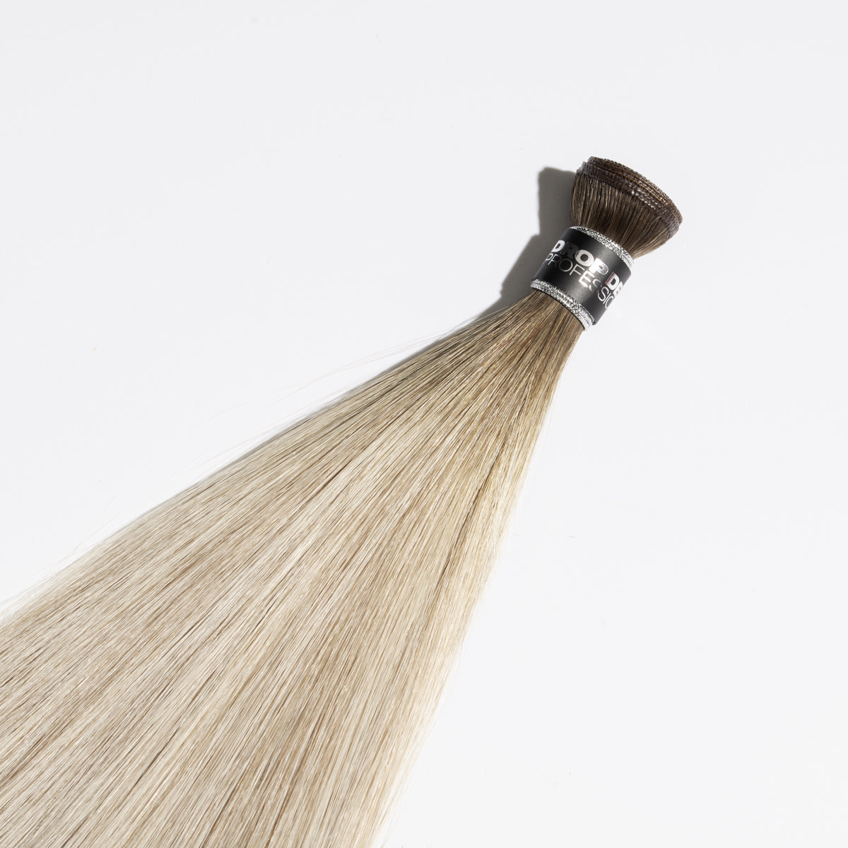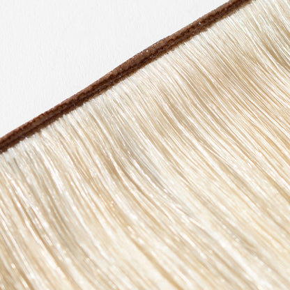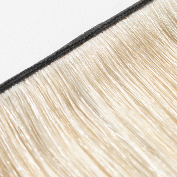 Each weft is 30” wide by 3.00mm high and can be cut to custom widths. Does not have a mustache. No silicones or coatings. Can be custom toned and colored. The wefts are made of polyurethane and are a suprising 1.00mm in thickness. Comparably, Drop Dead SuperTieds (a previous product, known for being the slimmest handtied in the world, before the SuperWeft replaced them) were thicker at 1.25mm thick. Super double-drawn with thick and full ends.