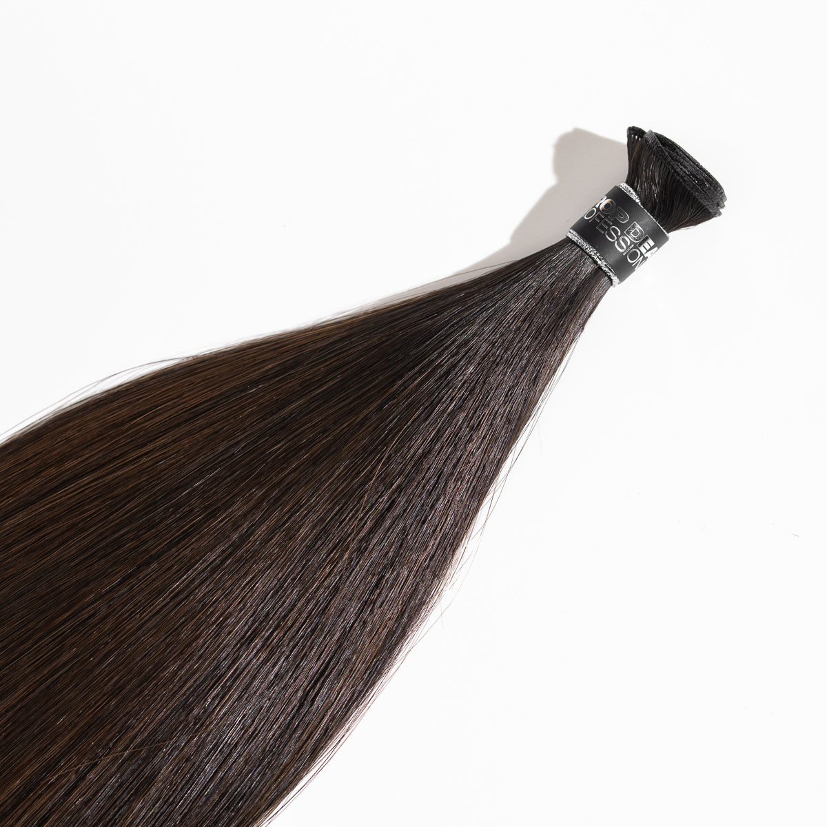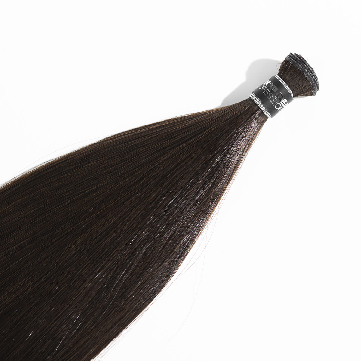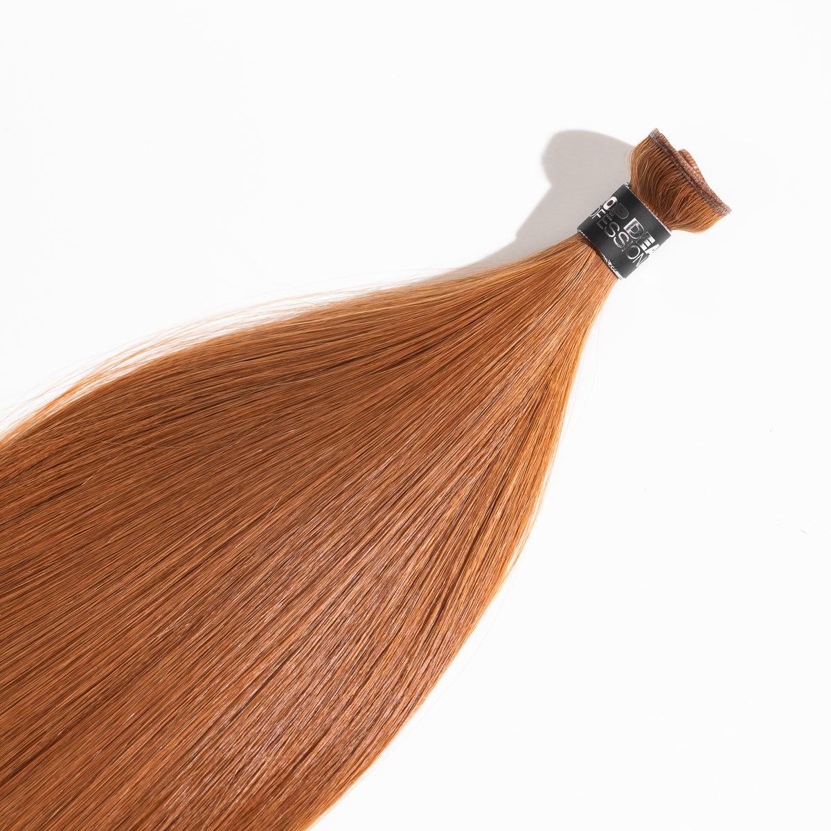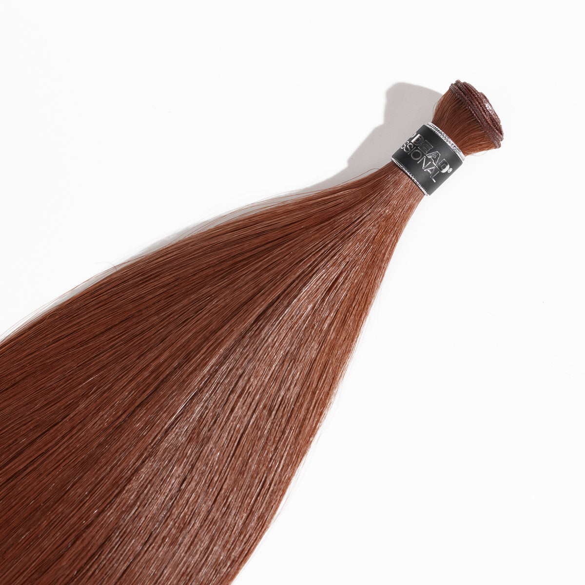 Each weft is 30” wide by 3.00mm high and can be cut to custom widths. Does not have a mustache. No silicones or coatings. Can be custom toned and colored. The wefts are made of polyurethane and are a suprising 1.00mm in thickness. Comparably, Drop Dead SuperTieds (a previous product, known for being the slimmest handtied in the world, before the SuperWeft replaced them) were thicker at 1.25mm thick. Super double-drawn with thick and full ends.