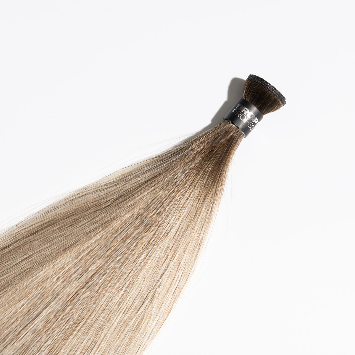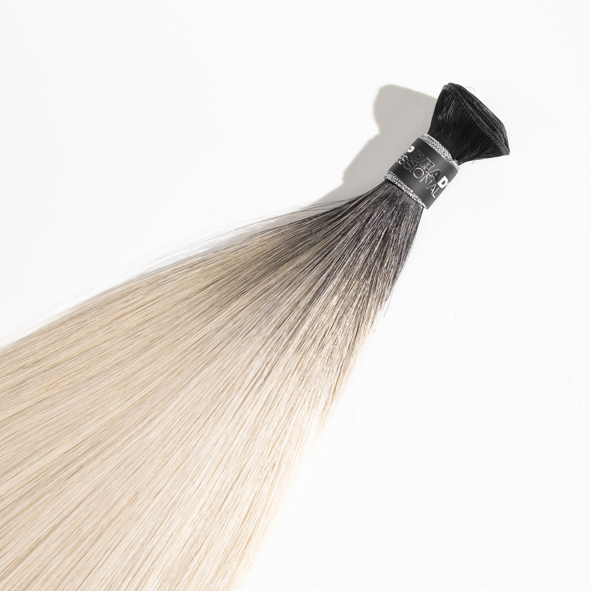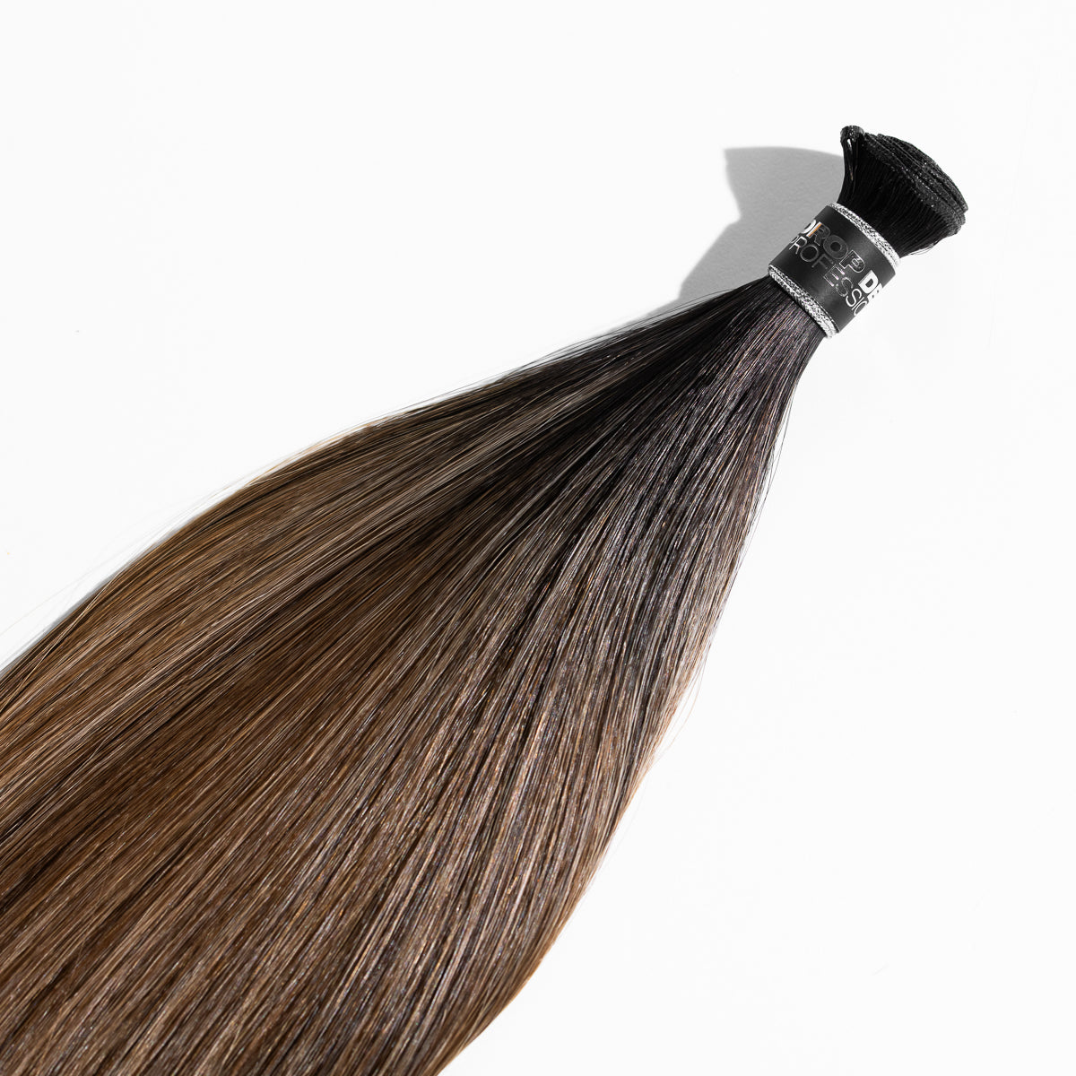 Balayage indicates that the bundle contains a root color that is seamlessly melted into one, two, or three other color combinations. Each color combination is a 10mm wide across the weft, giving a highlight/lowlight look for dimension, sometimes also considered a piano.